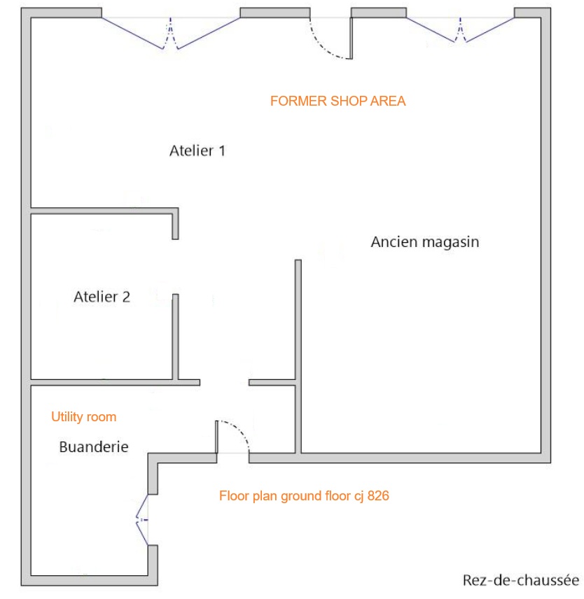 Grande pièce de 47,2 m², ancien local commercial, sol en lino, façade entièrement vitrée. Escalier menant à l’étage.